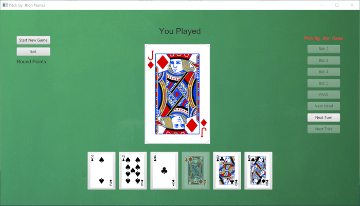 Implementation of the Pitch card game. The user has the options of selecting a 2, 3 or 4 player game. Each player other than the user is an AI player.